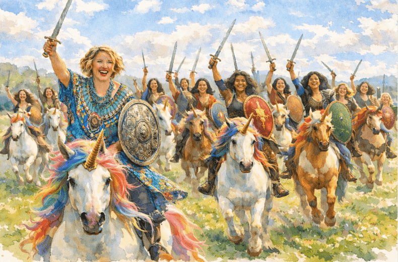 Then behind me, a whole soul army of women appear, all astride their own unicorns. All of us on our quests, together, birthing our miracles into the world with heart and courage and so much gladness.